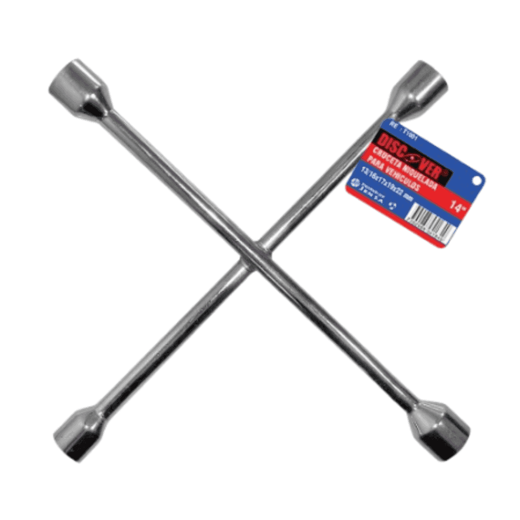 Cruceta níquel mate 14″ DISCOVER. Fabricada en acero, lo que le otorga una mayor resistencia al desgaste. Es la herramienta ideal para uso en automóviles y al momento de requerir realizar un cambio de llanta. Cuenta con cuatro copas de diferente medida para adaptarse a diferentes tamaños de pernos. Es ideal para uso en automóviles, camionetas o camiones.