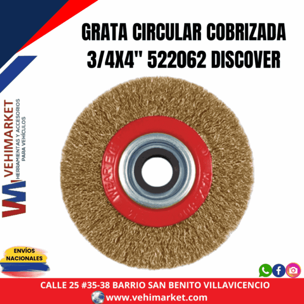 Grata circular cobrizada 3/4 x 4″ DISCOVER, Fabricada con acero de alta resistencia y durabilidad; Diseñada especialmente para trabajos de limpieza de materiales, pulido, remoción de óxido, pintura, retirar rebaba y muchos mas usos. Cuenta con adaptadores para ser usado con diferentes tipos de máquinas como esmeriles o pulidoras y adaptarse al eje. Es la herramienta ideal para uso en talleres e industria.