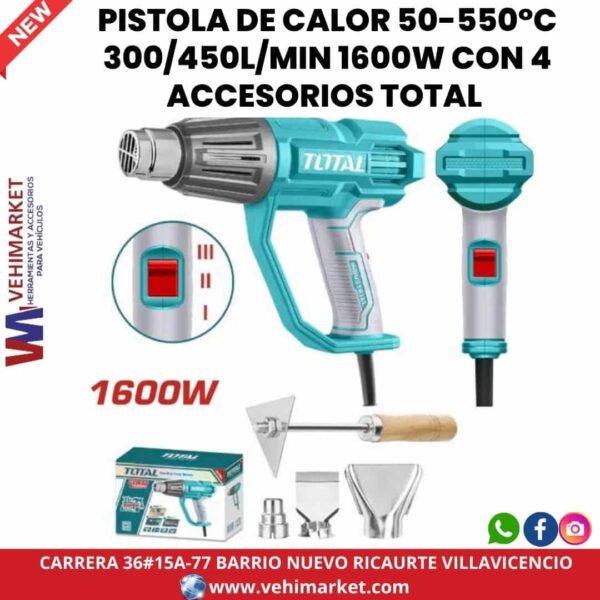 PISTOLA DE CALOR 50-550°C 300/450L/MIN 1600W CON 4 ACCESORIOS TOTAL